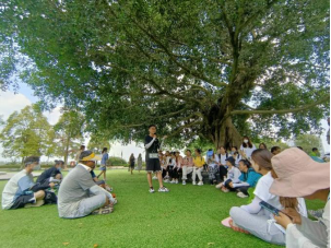 第二站,同学们来到了四川省乐山市,乐山地处四川盆地向西南山地过渡地带,是川西山水的中心。乐山大佛景区集聚了乐山山水人文景观的精华,是闻名遐迩的风景旅游胜地。同学们在乐山参观了高高耸立坐镇在岷江、大渡河、青衣江三江汇流之处巨型弥勒佛像,着重观察乐山大佛所具有的设计巧妙、隐而不见的排水系统以及其所在山区独特的地貌类型,并就地展开了积极地讨论。