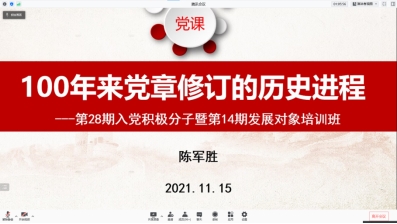 陈军胜作题为《100年来党章修订的历史进程》培训第一讲。他说,每一部党章的修订浓缩了党的历史,曲折、经验、成绩、教训都在党章中有所体现。他从民主革命时期中国共产党的党章、执政后党章的曲折发展变化、改革开放以来党章的修订发展和十九大党章修订的主要内容四个方面讲述了100年来党章修订的历史进程。中共一大到十九大,中国共产党创造出的卓越成就毫无疑问是无数共产党员的筚路蓝缕和呕心沥血;从嘉兴南湖到北京天安门,中国共产党用双脚丈量了祖国每一寸土地,用血和泪浇筑了新时代的大门。最后他强调,入党是一件光荣且严肃的事情,本期培训班重在提高积极分子和发展对象的个体质量,端正其入党动机,提高其能力素质。在学习过程中要带着问题学、与同学一起学,确保每一次学习都有所收获、有所成长。