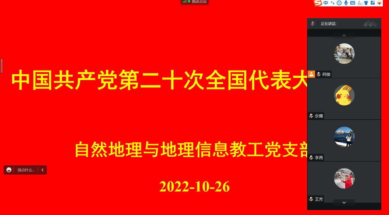 2022年10月22日,中国共产党第二十次全国代表大会胜利闭幕。为切实学习好、贯彻好党的二十大精神,自然地理与地理信息教工党支部于2022年10月26日下午线上组织全体党员学习了习近平总书记在中国共产党第二十次全国代表大会上的报告。