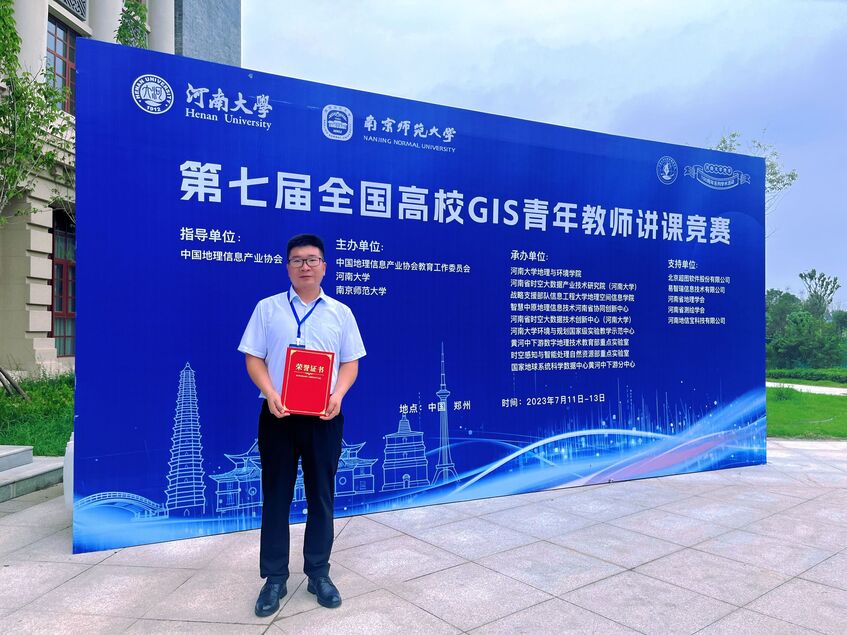 2023年7月11-13日,第七届全国高校GIS青年教师讲课竞赛在河南大学(郑州校区)成功举办。香港六合彩开奖结果查询 遥感与地理信息工程系教师李吉龙博士参加竞赛,并荣获一等奖。