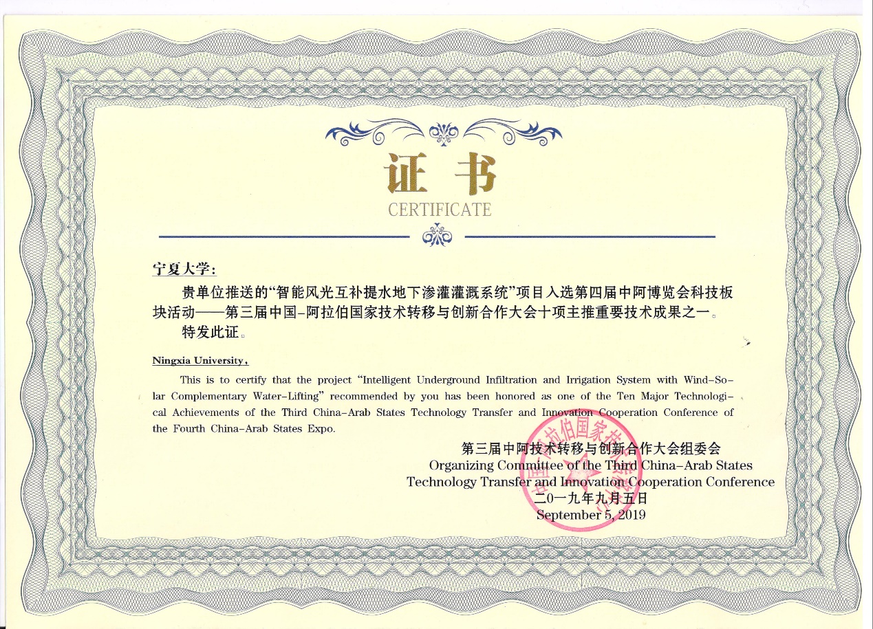 è¯¥æˆæžœé¢å‘“一带一路â€å’Œå®å¤å»ºè®¾é»„æ²³æµåŸŸç”Ÿæ€ä¿æŠ¤å’Œé«˜è´¨é‡å‘展先行区é‡å¤§éœ€æ±‚,立足å®å¤â€œå››æ°´å››å®šâ€åŠâ€œå…特â€äº§ä¸šå‘展,在å™å…†å†›æ•™æŽˆçš„牵头下,以å®å¤å¤§å¦ä¸ºç¬¬ä¸€å®Œæˆå•ä½ï¼Œè”åˆå¤§ç¦¹èŠ‚æ°´é›†å›¢è‚¡ä»½æœ‰é™å…¬å¸ã€è¥¿åŒ—农林科技大å¦ã€å®å¤å›žæ—自治区水利科å¦ç ”究陀€å®å¤å›žæ—è‡ªæ²»åŒºå†œç”°æ°´åˆ©å»ºè®¾ä¸Žå¼€å‘æ•´æ²»ä¸å¿ƒã€æ–°ç–†å†œä¸šç§‘å¦é™¢åœŸå£¤è‚¥æ–™ä¸Žå†œä¸šèŠ‚æ°´ç ”ç©¶æ‰€ç‰å•ä½ï¼Œåކç»10余年的探索与攻关,通过9项国家和çœéƒ¨çº§é¡¹ç›®ç³»ç»Ÿç ”究,开å‘å‡ºäº†å¤ªé˜³èƒ½é£Žèƒ½æ— è“„ç”µææ°´ã€æ–°åž‹å¤åˆæ¸—çŒåŠæ™ºèƒ½æŽ§åˆ¶ç‰æˆå¥—装备,çªç ´äº†å¤šé¡¹ä¸é˜¿æ—±åŒºé«˜æ•ˆèŠ‚æ°´æŠ€æœ¯ç“¶é¢ˆï¼Œç™»è®°æˆæžœ9项,授æƒä¸“利21项,登记软件著作æ�9项,出版专著2部,å‘表论文40篇,å‘å¸ƒåœ°æ–¹æ ‡å‡†3项,å‚åŠ ä¸å¤–åšè§ˆä¼�11æ¬¡ï¼Œâ€œæ™ºèƒ½é£Žå…‰äº’è¡¥ææ°´åœ°ä¸‹æ¸—çŒçŒæº‰ç³»ç»Ÿâ€å…¥é€‰ç¬¬ä¸‰å±Šä¸é˜¿æŠ€æœ¯è½¬ç§»ä¸Žåˆ›æ–°å¤§ä¼šåé¡¹ä¸»æŽ¨æˆæžœï¼Œä¸¾åŠžå›½é™…å¦æœ¯ç ”讨会和培è®ç22期,培è®23个国å®�2764äººæ¬¡ã€‚æˆæžœåœ¨å®å¤åŠæˆ‘国西北和å¡å¡”å°”ã€é˜¿æ›¼ç‰å›½è§„æ¨¡åŒ–åº”ç”¨ï¼Œæ ¸å¿ƒæŠ€æœ¯åº”ç”¨äºŽå¡å¡”尔世界æ¯ç»¿åŒ–é¡¹ç›®ï¼Œæˆæžœåœ¨å…¨çƒå…¸åž‹æ—±åŒºåº”用æå‡äº†æˆ‘区节水技术的国际影å“力ã€�
