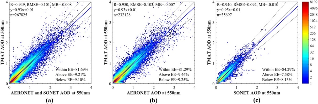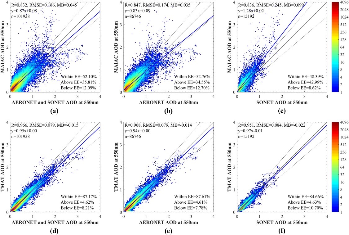 �3. TMAT-AOD和AHI-MAIAC AOD的验证比较。其中,AHI-MAIAC AOD为基于AHI数据和MAIAC算法生成的AOD数据集�