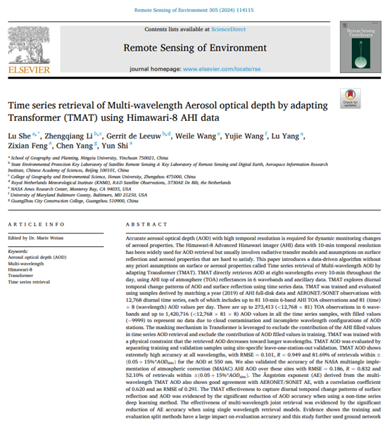 引用格式:Lu She, Zhengqiang Li, Gerrit de Leeuw, Weile Wang, Yujie Wang, Lu Yang, Zixian Feng, Chen Yang, Yun Shi, 2024. Time series retrieval of Multi-wavelength Aerosol optical depth by adapting Transformer (TMAT) using Himawari-8 AHI data, Remote Sensing of Environment, 305, 114115.