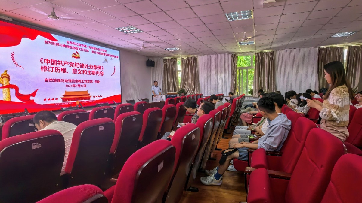 为准确把握党纪学习教育的目标要求,教育引导党员教师学生学纪、知纪、明纪、守纪,搞清楚党的纪律规矩是什么,弄明白能干什么、不能干什么,把遵规守纪刻印在心,内化为言行准则。5月22日,自然地理与地理信息教工党支部联合励行书院地理学研究生党支部,深入开展学习新修订的《中国共产党纪律处分条例》为主题的党日活动。自然地理与地理信息教工党支部书记何俊主持并作党纪学习教育专题辅导,30余名党员参加辅导报告。