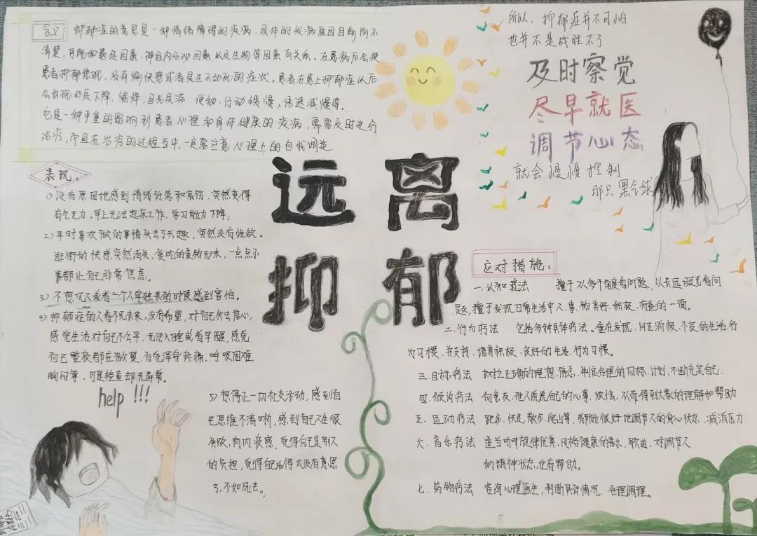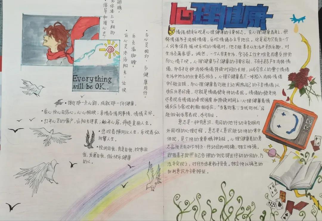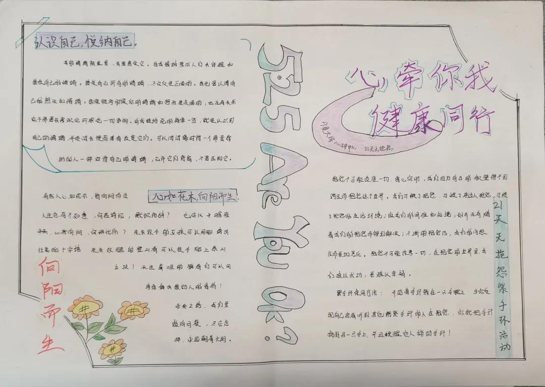 101教室观看《理想照耀中国》的电影,使学生在自我领悟、自我反省、自我提高中,达到自我教育的目的,同时帮助同学们树立维护心理健康的意识。此外,各班心理委员组织本班同学召开班会,并以手抄报的形式表达自己对心理健康的看法。同学们参加活动热情高涨,手抄报的画风各异,他们各自施展才能,在手抄报的样式及色彩搭配上各显神通,不仅如此,在文字版面的心理小知识也同样别出心裁。